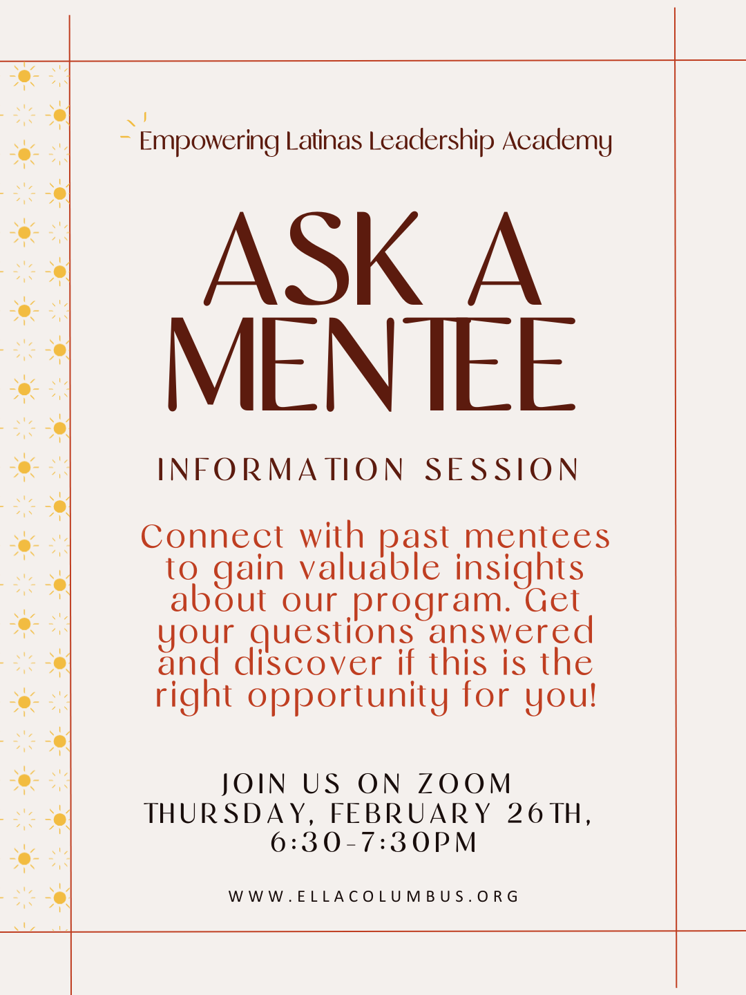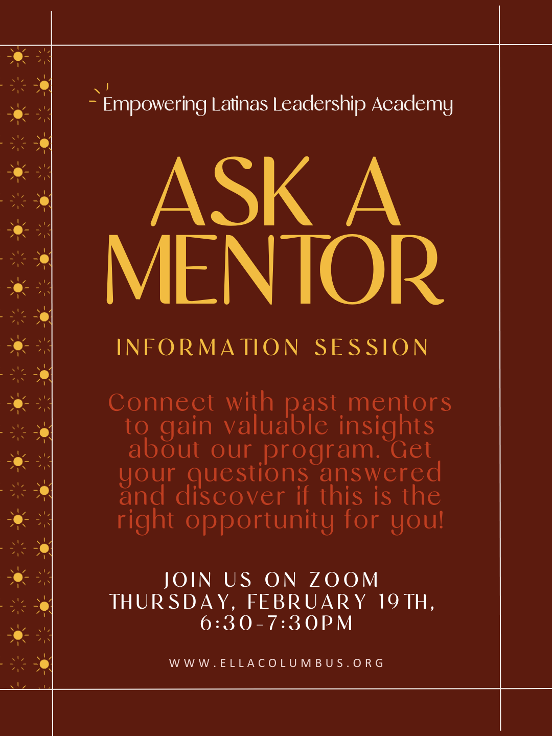 As a professional development organization that also provides board readiness, the purpose of Empowering Latinas Leadership Academy (ELLA) is to provide Latinas with the knowledge, skills, and resources they need to succeed in their chosen careers and become leaders in their fields. Through this dual focus, Empowering Latinas Leadership Academy aims to increase the representation of Latinas on boards, promote diversity, equity, and inclusion in leadership roles, and promote Latinas' voices to be included in Columbus Ohio's crucial decision-making. By offering training, mentorship, and networking opportunities, Empowering Latinas Leadership Academy seeks to empower Latinas to advance professionally, break down barriers, and achieve their full potential as leaders who can positively impact their communities and society as a whole.
